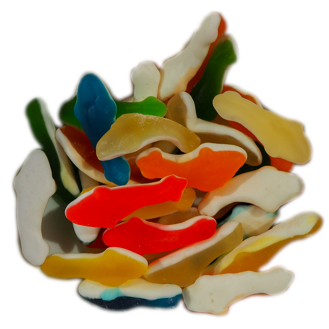 A small version of a friendly “Jaws”. Colourful gummi Sharks that look great on a cake or “swimming” in a bowl. Bite them before they bite you!