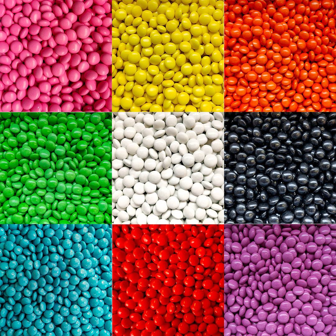 Pebbles/Rainbow buttons are a similar product to M&Ms. They are a candy coated chocolate with a variety of different colour candy on the outside.