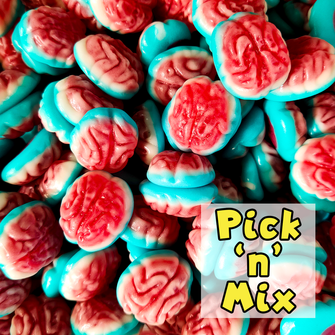 Gummy lollies with a jelly filled centre. Filled brains are delicious and perfect for Halloween or a pick n mix! Filled brains sounds strange but the taste is great!