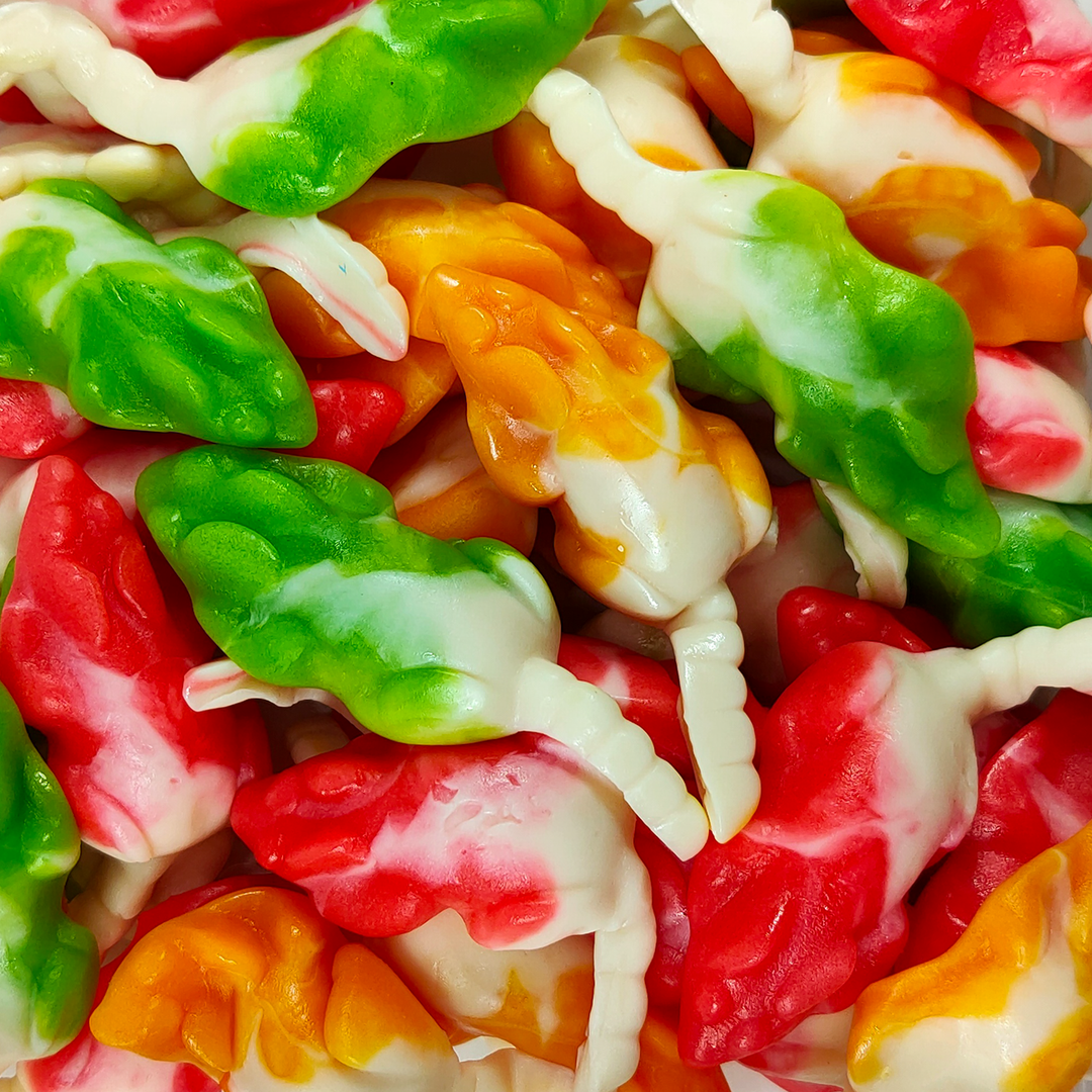 Ingredients:Glucose syrup,sugar,water,Potato mod starch,gelatine, acidulant E330,E296 E270, flavours, colours E102 E129 E133 E171, vege oil(palm),glazing agent, carnauba wax
