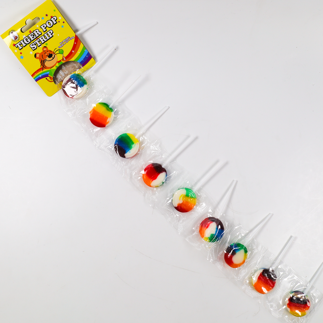 Tiger Pop Strip lollipops. A fun 10 pack strip of rainbow lollipops. These lollipops are great for parties and a great price!Â